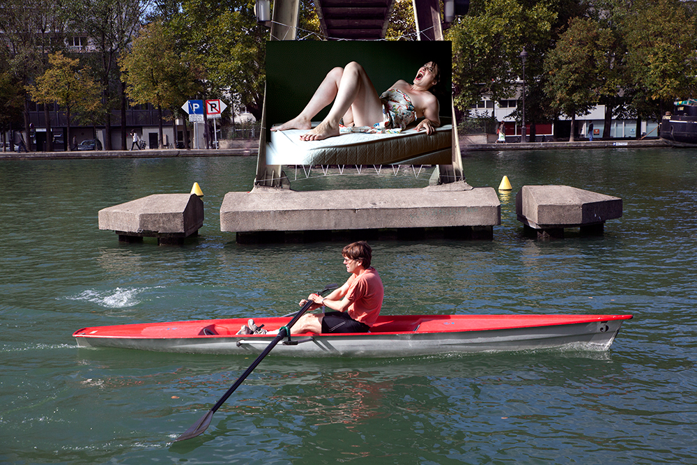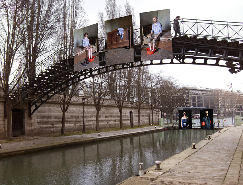 Tout d’abord, il fallut environ deux ans pour obtenir toutes les autorisations nécessaires : « on expose pas comme ça dans la ville », ce que l’on m’a dit dans les bureaux pour jauger ma motivation. Soit. A qui faut-il demander ? Commencer par une Mairie, expliquer, convaincre, parler d’art en temps de crise… Puis l’administration, celle de Kafka, un Léviathan pour un léthé, quoi de plus normal après tout : préfecture de police, service de communication de la ville, service de la voirie, service des canaux, de la police fluvial, à quoi il faut encore ajouter les organismes indépendants propriétaires des lieux choisis : sncf, edf etc… Deux ans donc. Vient le grand jour de l’installation. Louer un grand camion, demander aux amis de se lever un samedi matin, dégoter un cordiste, penser à assurer tout son monde. Le grand jour il pleut, un vrai déluge, une partie de l’équipe des amis reste au lit pensant que l’autre se lèvera, en attendant 85m2 de bâches et de Dibond attendent sous la douche de Septembre. Pas grave : rattraper le retard et ajouter un dimanche au samedi pour tout accrocher. Après 48h sous la pluie, les vents, le froid, nous sommes Lundi, l’heure d’en profiter pensais-je, erreur : une tempête s’abat sur Paris, mettant à terre la moitié de l’exposition. Il faudra une semaine entière pour tout réparer.
