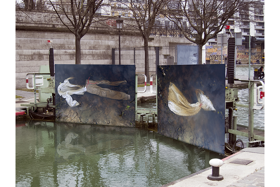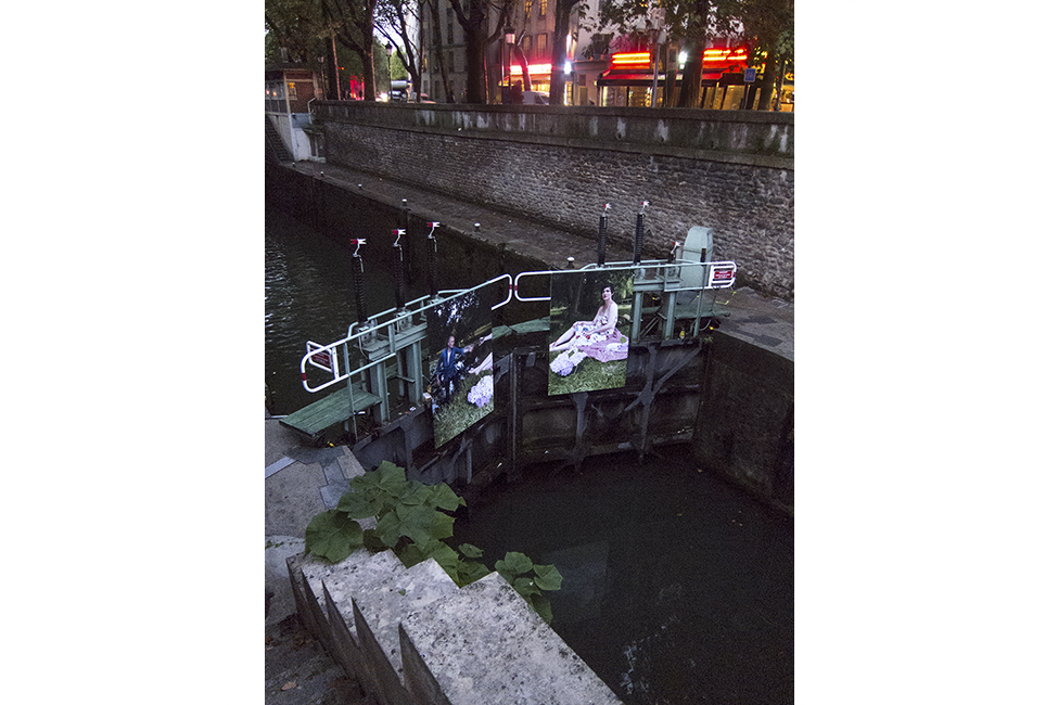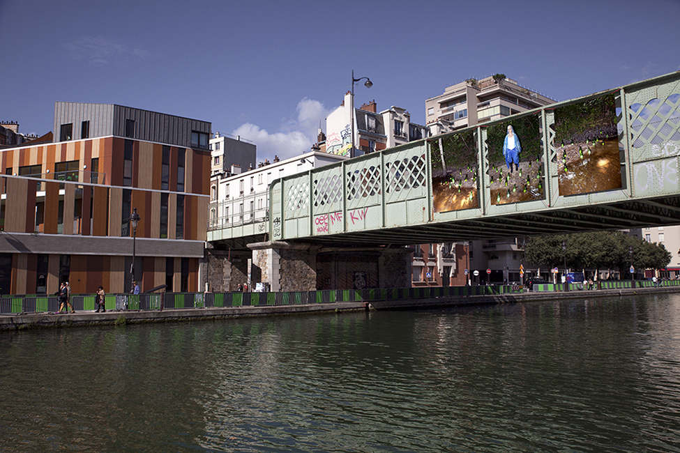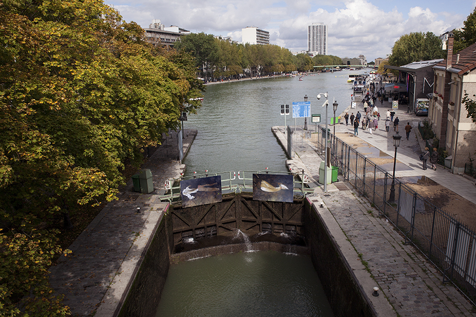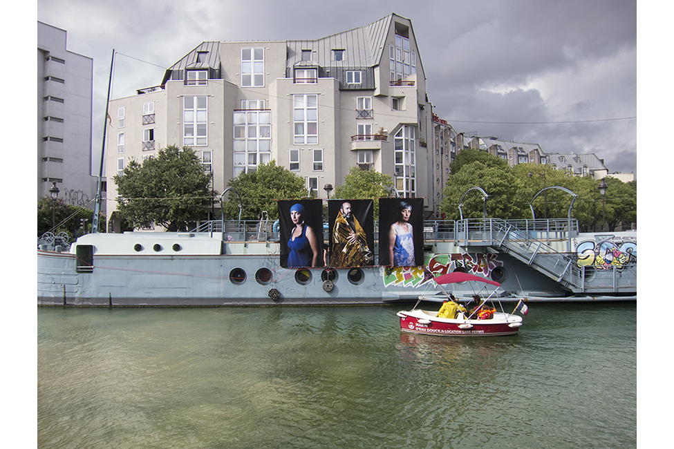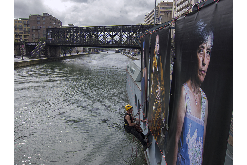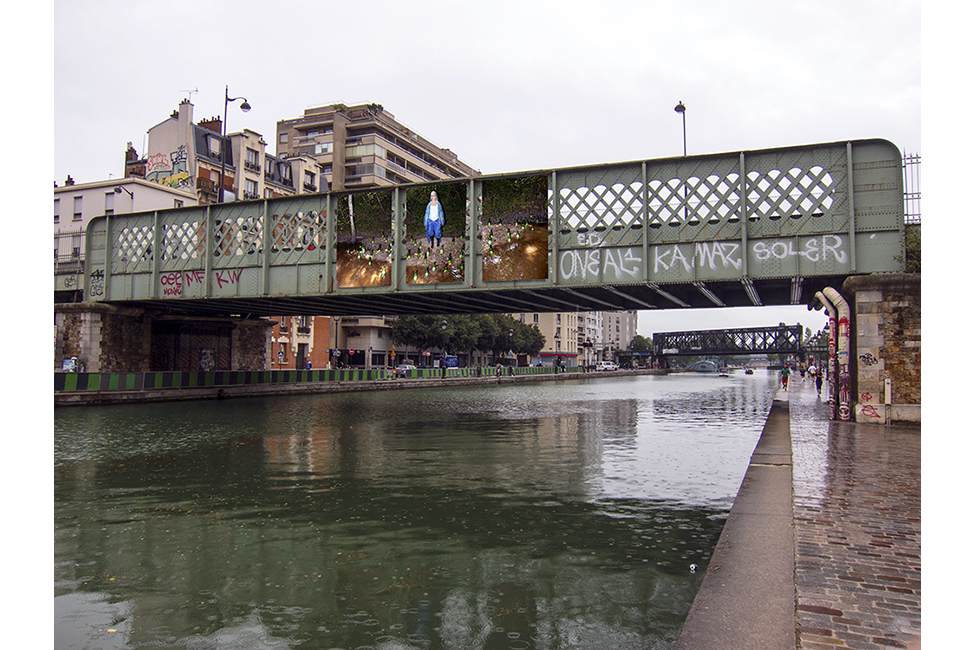 It took about two years to obtain the necessary authorizations: “exhibitions like this are not done in the city,” officials told me to gauge my motivation. All right. So whom do I ask? Start with the town hall of the arrondissement, explain, make your case, talk about art in times of crisis… Then approach the administration, the police department, communications department, road services, canal services, the river police, to which one must also add independent agencies that own the selected sites: the national railways, electricity supplier… It took two years. Then came the big day to mount the installation. On the big day it rained, a real downpour, half the friends on my team stayed in bed hoping that the other half would get up. In the meantime, 85 square meters of tarp and dibond were sitting under September showers. No big deal: we catch up by working through Saturday and Sunday to hang it all up. After 48 hours of rain, wind, and cold, comes Monday, time to sit back and enjoy it, I thought. Big mistake: a storm hit Paris, tearing down half the exhibition. It took another week to replace everything.