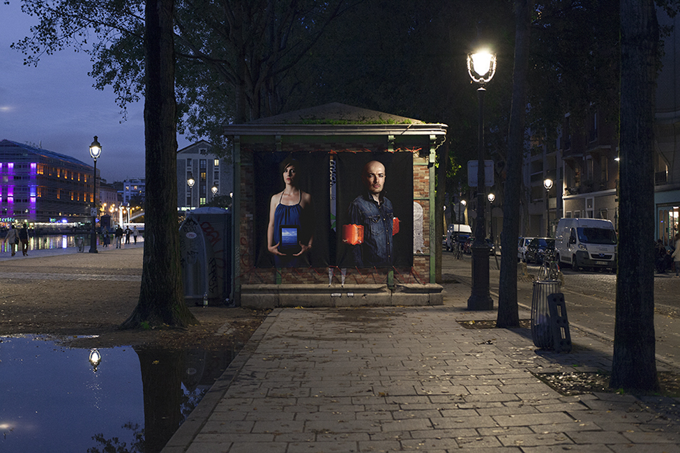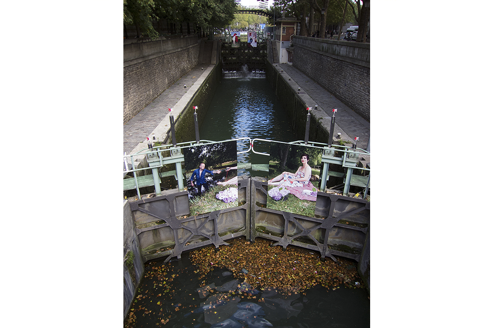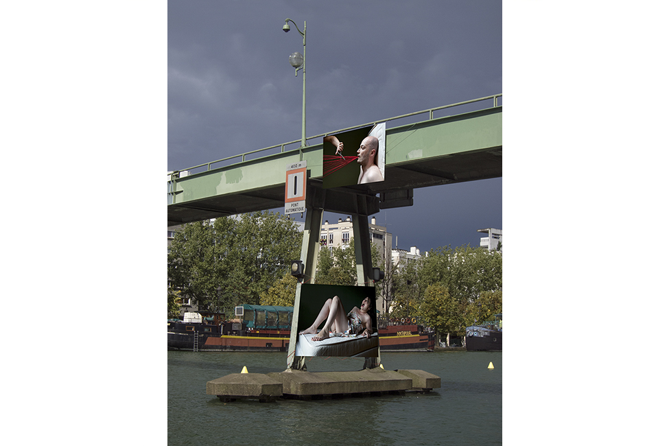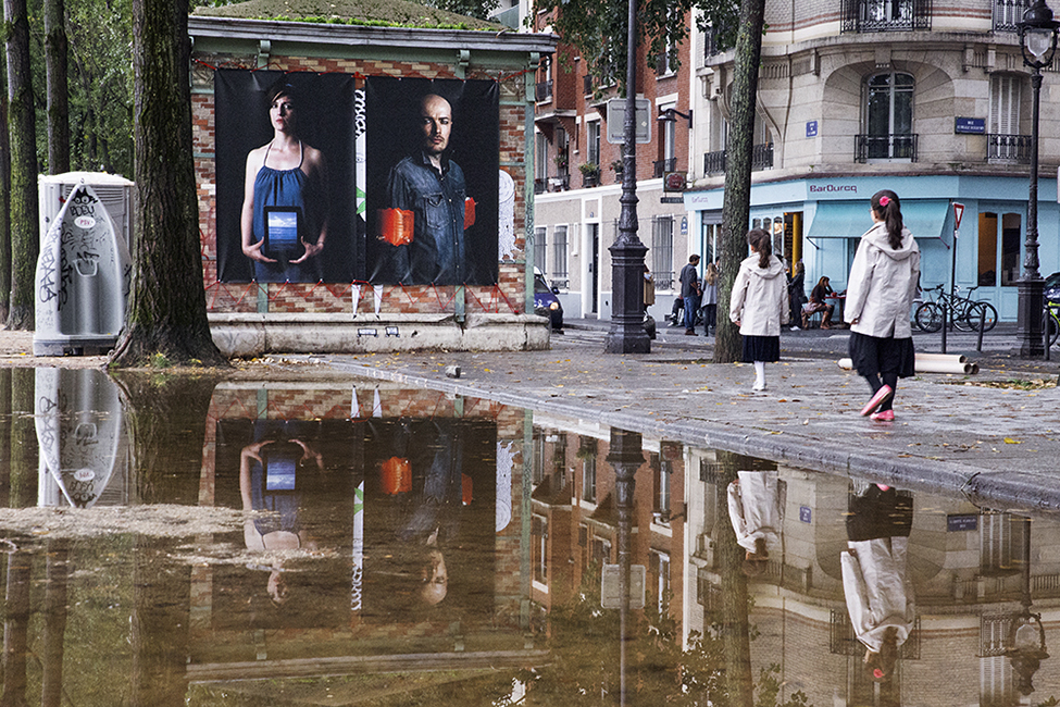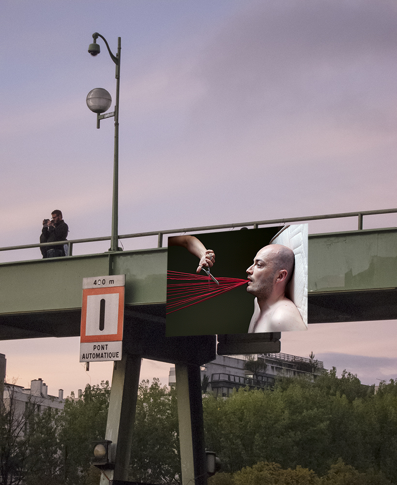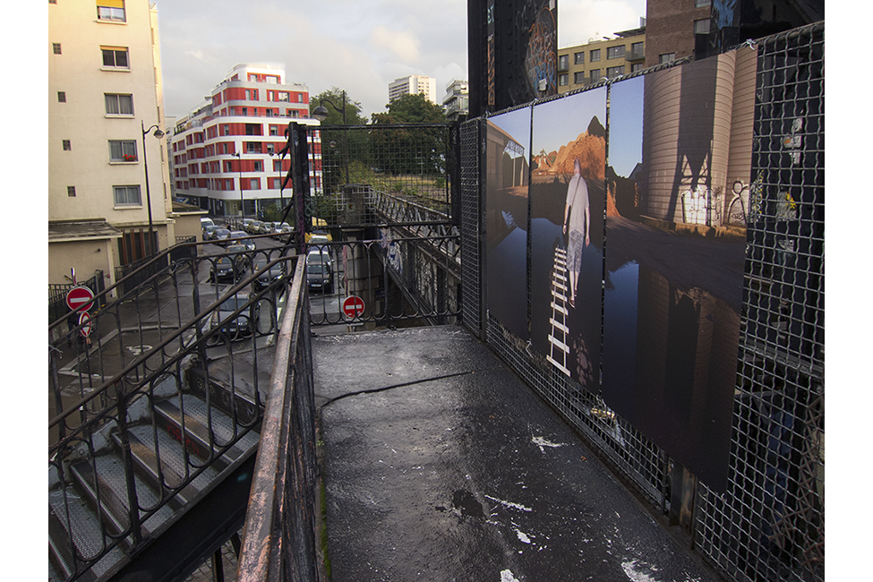 It took about two years to obtain the necessary authorizations: “exhibitions like this are not done in the city,” officials told me to gauge my motivation. All right. So whom do I ask? Start with the town hall of the arrondissement, explain, make your case, talk about art in times of crisis… Then approach the administration, the police department, communications department, road services, canal services, the river police, to which one must also add independent agencies that own the selected sites: the national railways, electricity supplier… It took two years. Then came the big day to mount the installation. On the big day it rained, a real downpour, half the friends on my team stayed in bed hoping that the other half would get up. In the meantime, 85 square meters of tarp and dibond were sitting under September showers. No big deal: we catch up by working through Saturday and Sunday to hang it all up. After 48 hours of rain, wind, and cold, comes Monday, time to sit back and enjoy it, I thought. Big mistake: a storm hit Paris, tearing down half the exhibition. It took another week to replace everything.