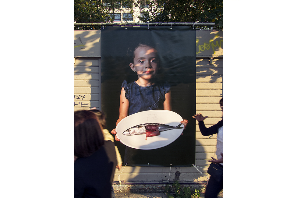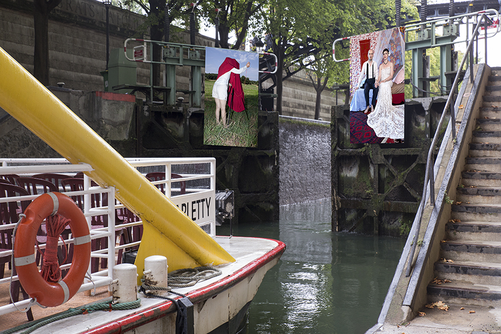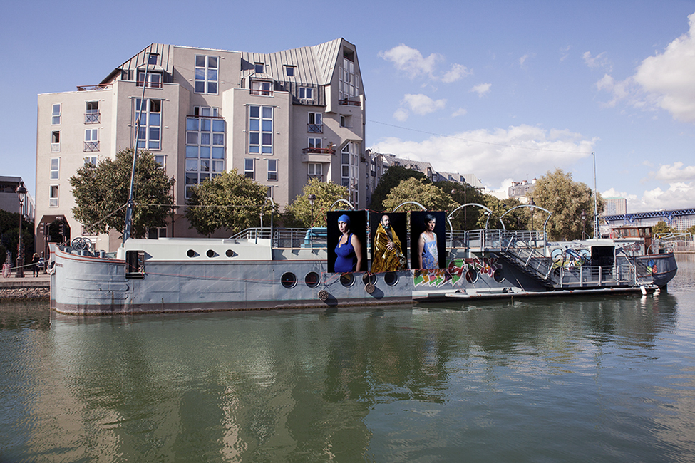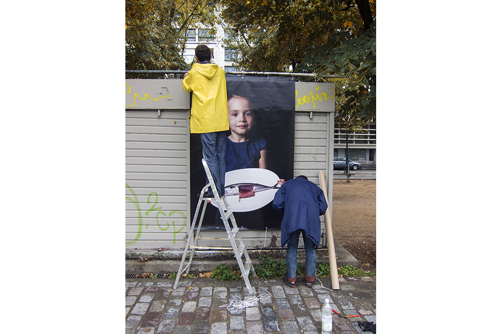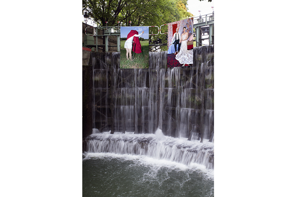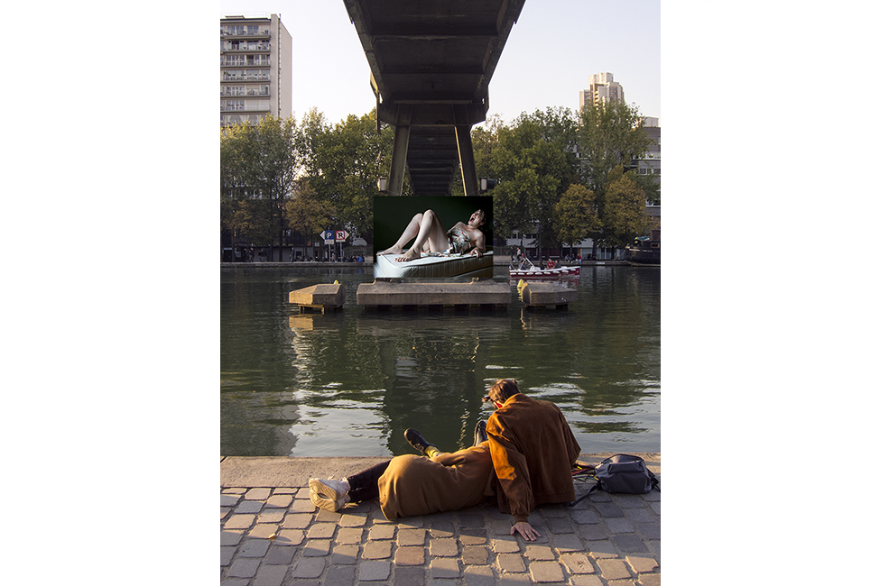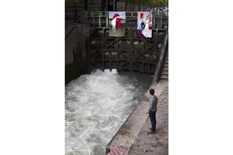 It took about two years to obtain the necessary authorizations: “exhibitions like this are not done in the city,” officials told me to gauge my motivation. All right. So whom do I ask? Start with the town hall of the arrondissement, explain, make your case, talk about art in times of crisis… Then approach the administration, the police department, communications department, road services, canal services, the river police, to which one must also add independent agencies that own the selected sites: the national railways, electricity supplier… It took two years. Then came the big day to mount the installation. On the big day it rained, a real downpour, half the friends on my team stayed in bed hoping that the other half would get up. In the meantime, 85 square meters of tarp and dibond were sitting under September showers. No big deal: we catch up by working through Saturday and Sunday to hang it all up. After 48 hours of rain, wind, and cold, comes Monday, time to sit back and enjoy it, I thought. Big mistake: a storm hit Paris, tearing down half the exhibition. It took another week to replace everything.